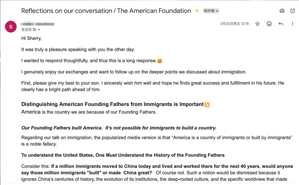 好像是因为她的不雅点过于颠覆,与我惯有念念维太不同了,这封标题为Reflections on our conversation/The American Foundation的覆信,一运行让我颇难接收,致使感到些微的不安逸。