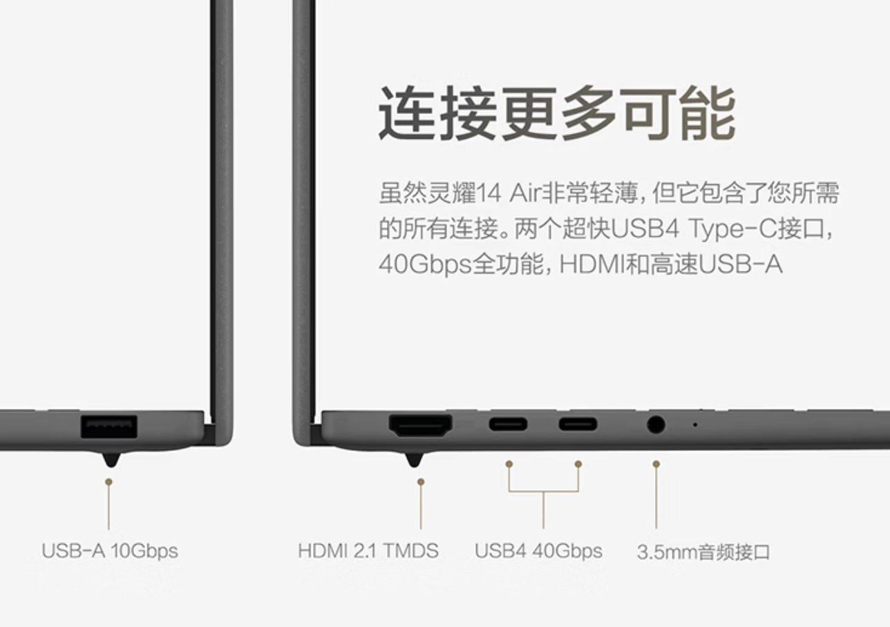 I/O 方面,该机左侧提供 1 个 HDMI 2.1 接口、2 个 USB4 接口、1 个 3.5mm 音频接口;右侧配备 1 个 USB-A 10Gbps 接口。